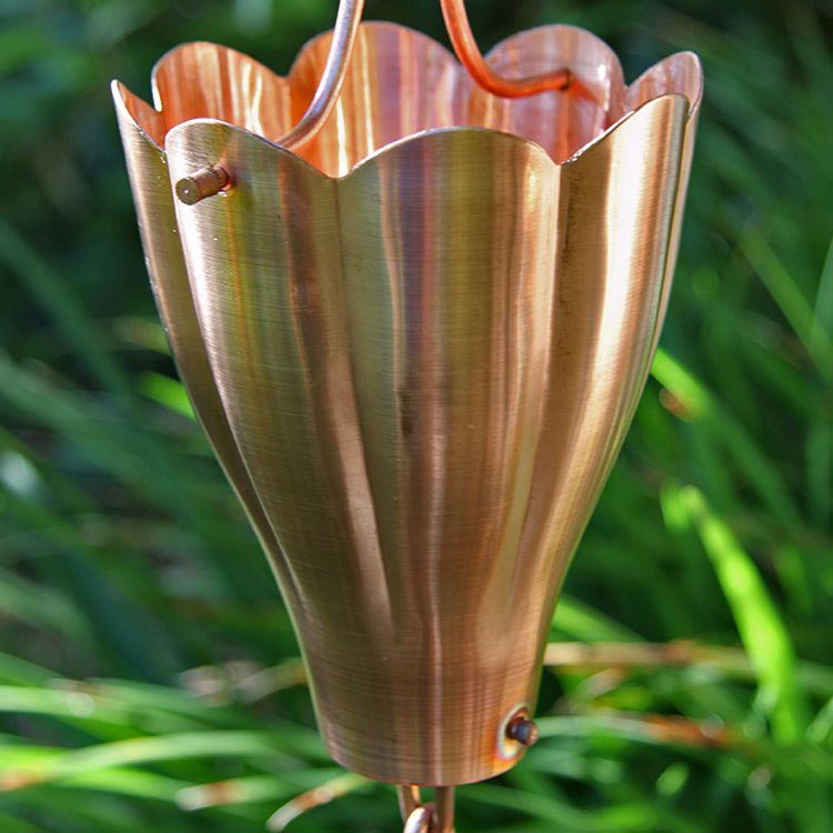 The XL Scallop Cups Rain Chain combines beauty and functionality. The scalloped edges of each cup provide a sophisticated look, while their large size ensures efficient water capture and flow. This rain chain is an excellent choice for homeowners seeking both style and performance.