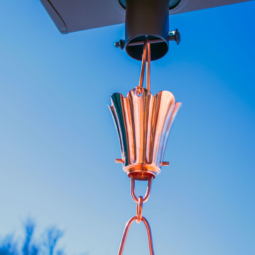 Link style rain chains are an excellent choice for windy areas. Their design allows wind to pass through rather than catching it, which reduces swaying and potential damage. The open design lets wind flow through, minimizing resistance. With fewer parts to break or get damaged, link style chains are generally more robust in extreme weather. Despite their simplicity, link style chains can be very elegant and come in various styles and finishes.