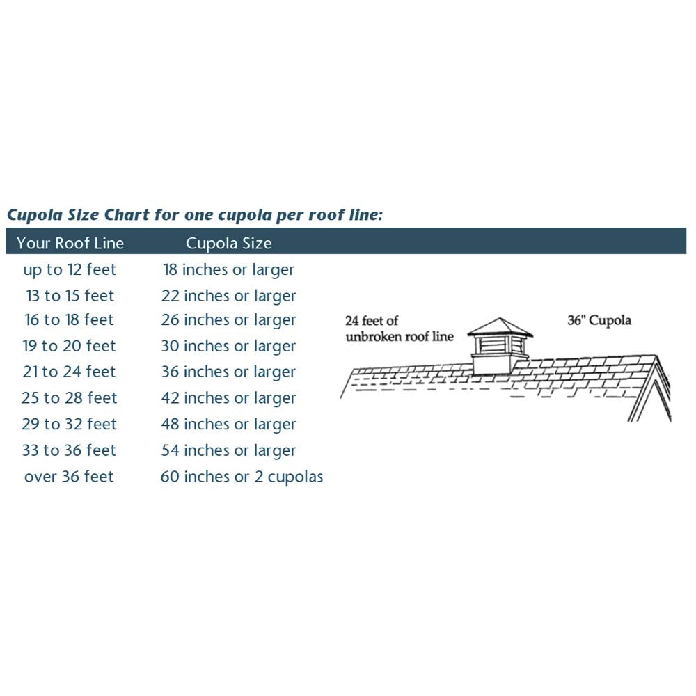 Square size measured at roofline. Fits up to a 10/12 pitch roof (most roofs). When calculating the size of your cupola, use our steadfast builder's rule of thumb: 1.5 inches of cupola width for every foot of unbroken roofline. See last photo for more information.