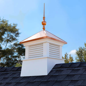 Since 1982, Good Directions cupolas have been the perfect complement to your home. Our expertly crafted, made to order, Manchester louvered cupola features roof molding and reinforced interior supports for added strength. It's made to order in the USA from durable, maintenance free Royal Brand PVC vinyl, constructed with precision using a CNC Router for accuracy and a lifetime of enjoyment. The Manchester features a grade 1, 16 ounce, 24 gauge copper, hip style roof that adds an architectural element of beauty and lasting value to your home.