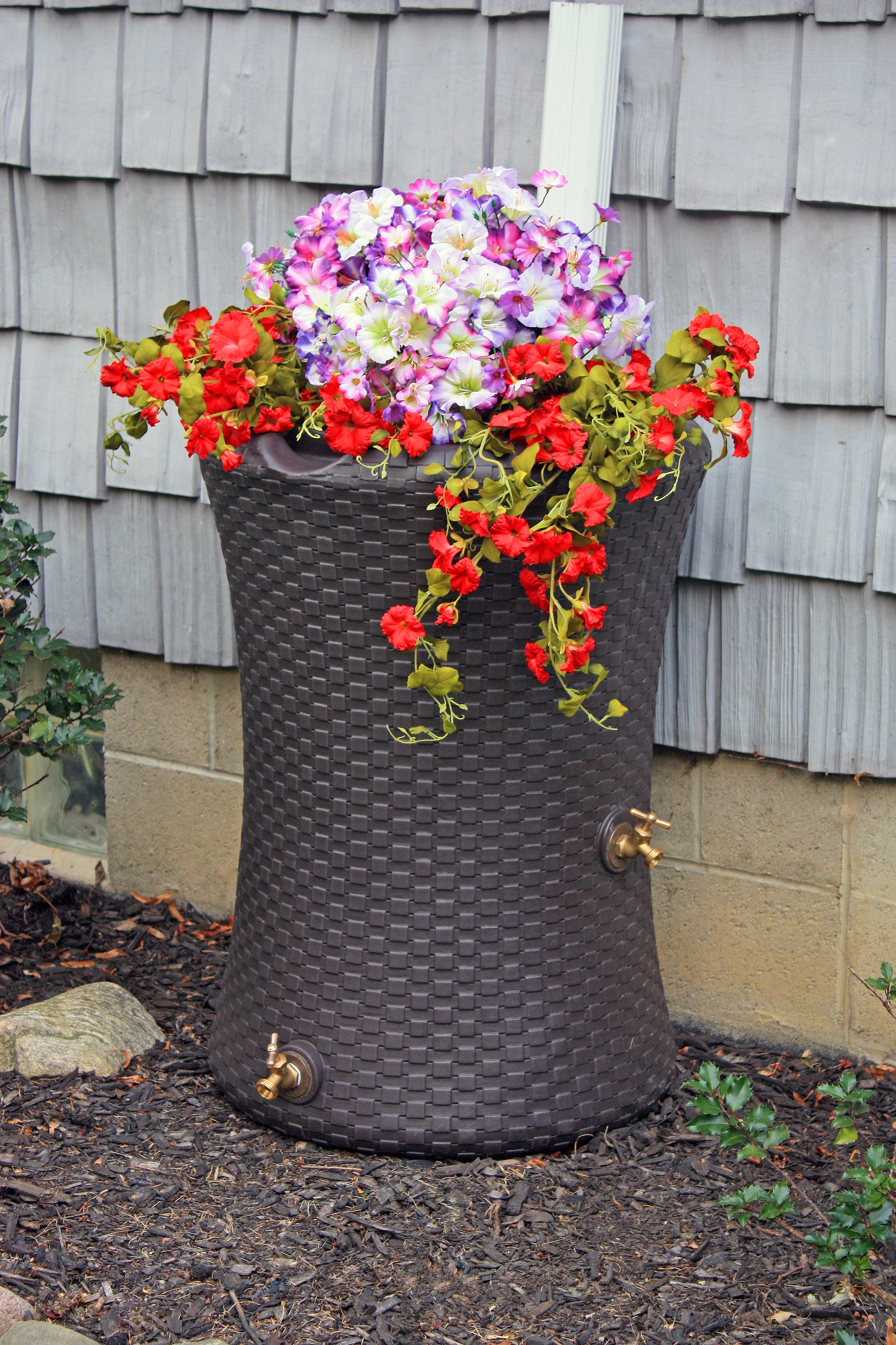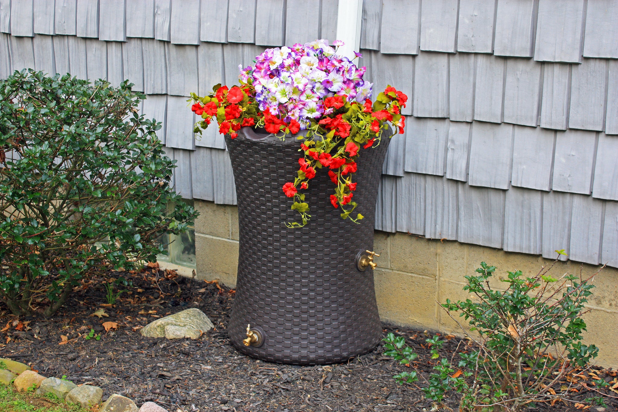 The Impressions rain barrel collection reinvents how you harvest rain water. This 50 gallon Nantucket design is sturdy and one of the most eye-catching rain barrels on the market. And it's one of the only wicker designs that will never unravel or fray. With a deep welled top, you can plant an array of floral arrangements or even a small herb or vegetable garden. The top also includes the Good Ideas original, integrated overflow channel. This channel automatically diverts all overflow water to the front of the barrel and keeps your foundation from flooding. The large opening which can be used for 2x3 or 3x4 downspouts is covered with a soft, fine mesh, plastic screen. This screen keeps out heavy debris and insects for your piece of mind. Also included with the barrel are the two, offset spigot locations. Now you can use a five gallon bucket or hose simultaneously without issue. Or use the second spigot as an overflow into a second barrel. Who knew you could have so many features in a rain barrel? Impress your friends and neighbors with the Impressions Nantucket 50 Gallon Rain Saver.