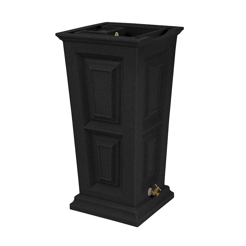 Savannah Rain Savers are a thing of beauty and clever design. Constructed with thick and durable polyethylene resin which holds up to the harshest elements, the exterior has the appearance of a colonial planter. The strong, regal lines and trim on the exterior make it an accent piece on your homes exterior and not something that just sticks to your house. The flat back design optimizes space used and allows you to position the barrel close to walls or flat areas. The top is the only of its kind that acts as a planter space and also self-drains when excess water is present. There is also a channel built into the rim which diverts overflowing water to the front and away from the barrel and home foundation.