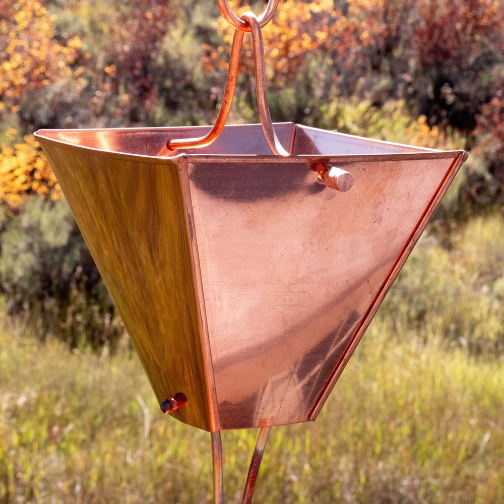 The Extra Large Square Cups Rain Chain is the largest available. The Extra Large Square Cups have beautifully clean, straight lines. Individually crafted by hand, each side is press seamed for superior strength and durability. Available in pure copper, raw aluminum, and aluminum with Black, Bronze, or Patina powder-coat. Lengths of 20 feet and longer are not recommended due to the weight of this rain chain. We do not advise installing long drops of this chain in colder climates.