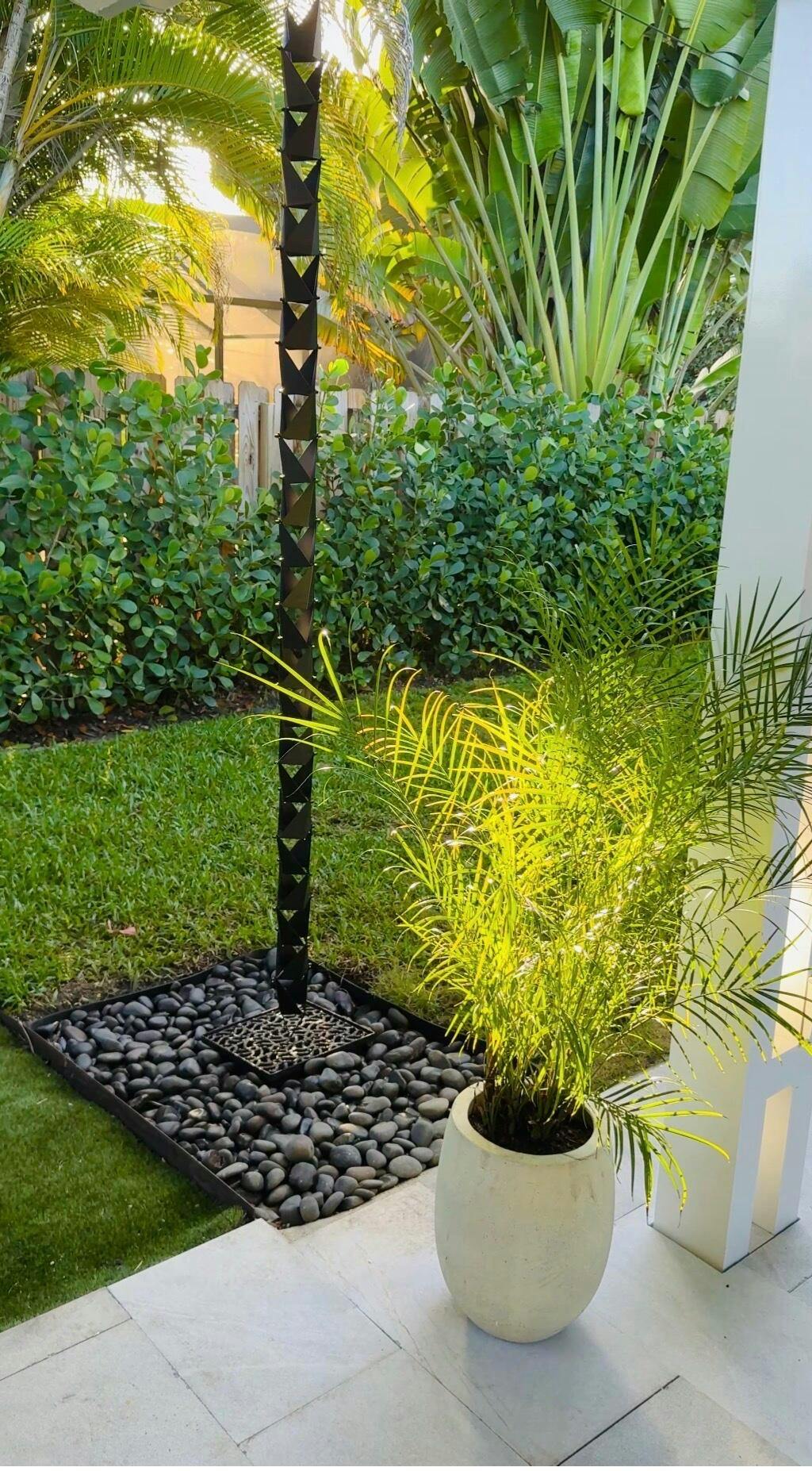 This delicate origami inspired rain chain design is highly efficient and can handle a variety of rainfall conditions. It’s made up of beautiful and interesting angular shapes that intersect to make a mesmerizing design. Even though it’s very open looking and modern, it transports water very well!