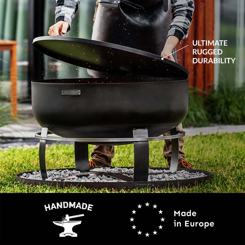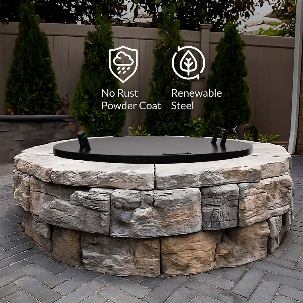 Enjoy endless memories gathered around the fire pit knowing the cover lid will outlast outdoor elements and strong winds. The sleek round metal fire pit cover features smooth edges to ensure safety and adds a touch of class that seamlessly complements the relaxed outdoor atmosphere. No assembly is needed. For safety, it's recommended to use gloves to protect your hands during transportation.