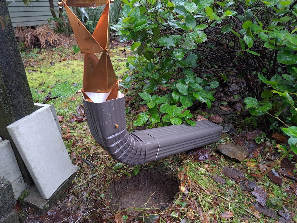 To eliminate a puddle near the deck post, I installed the chain into an elbow. So now we can enjoy watching water fall while still diverting it almost as well as a solid downspout would.